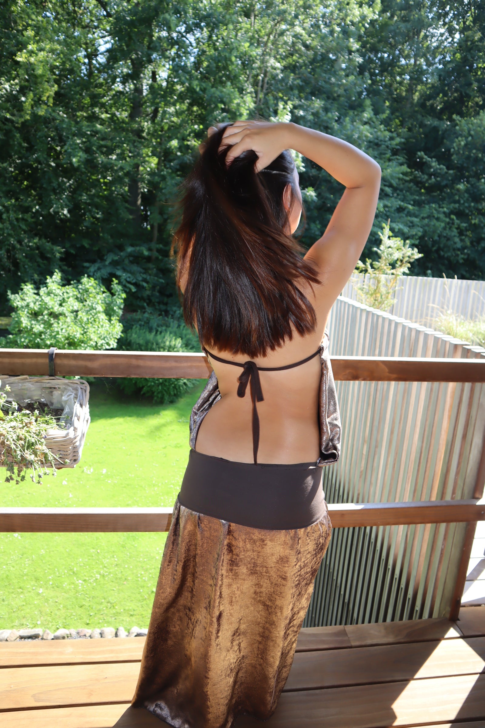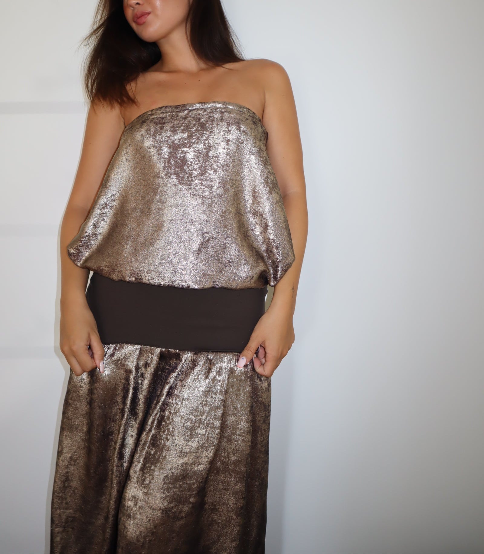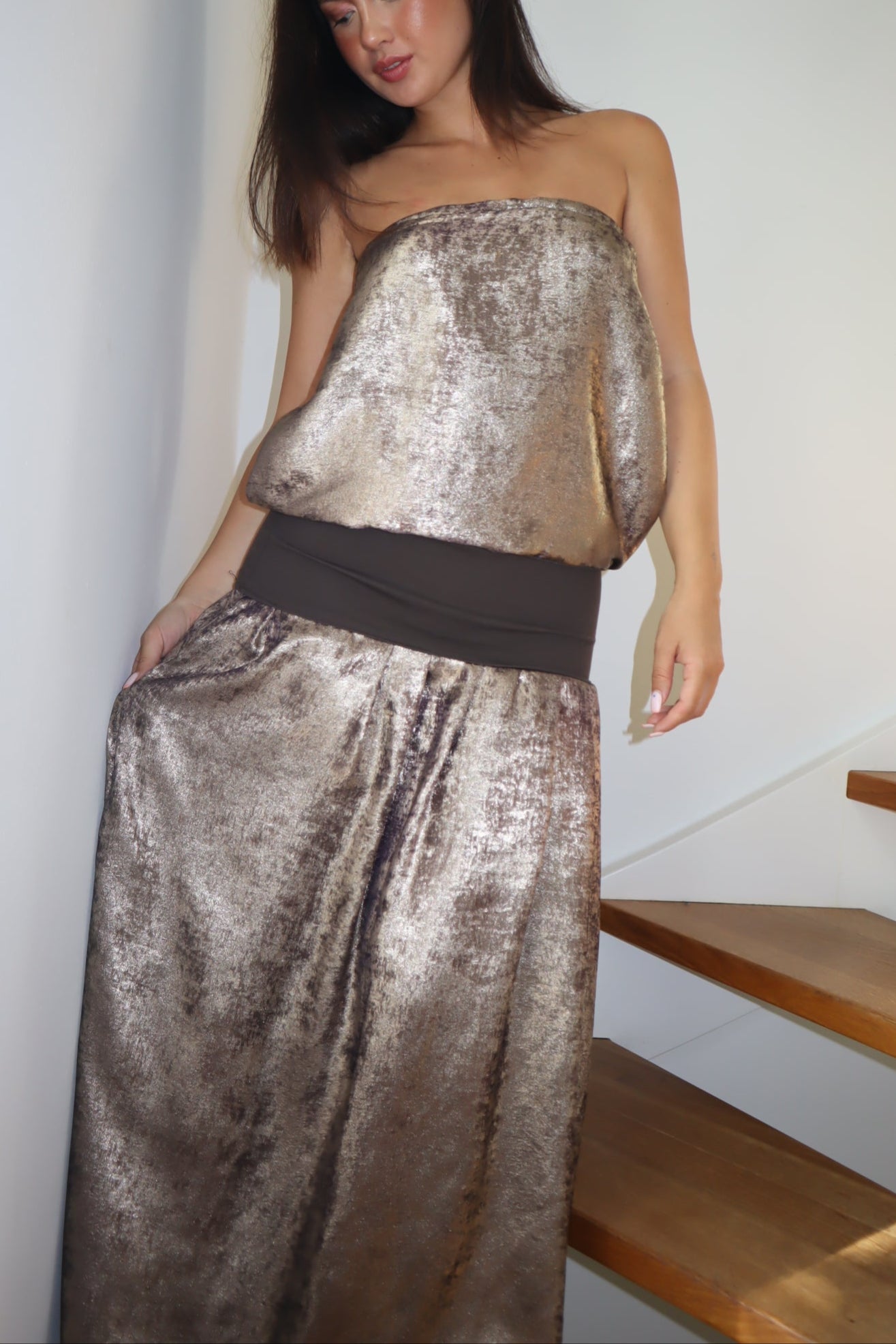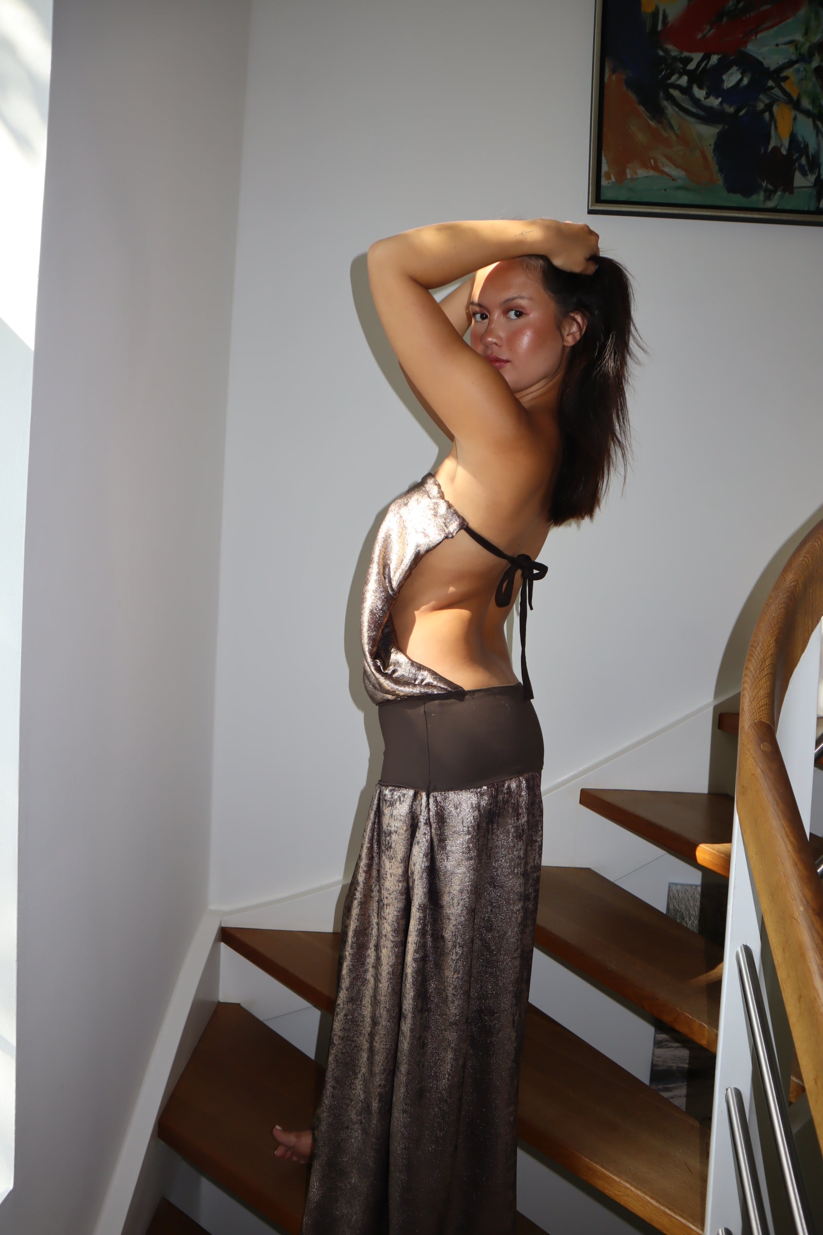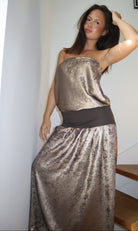 Meet Salomé — a dress made to turn moments into memories. Designed in glowing gold and rich dark brown, this floor-length piece drapes like liquid light and moves with grace.