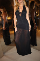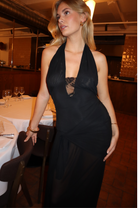 A stunning and timeless design, this dress features a graceful cowl neck adorned with delicate lace for an added touch of sophistication. The open back introduces a playful, contemporary flair, creating a perfect balance of elegance and allure. Crafted from lightweight mesh fabric, it offers both exceptional comfort and a flattering fit. Ideal for a glamorous evening or a memorable event, this dress is sure to become a cherished staple in your wardrobe.