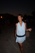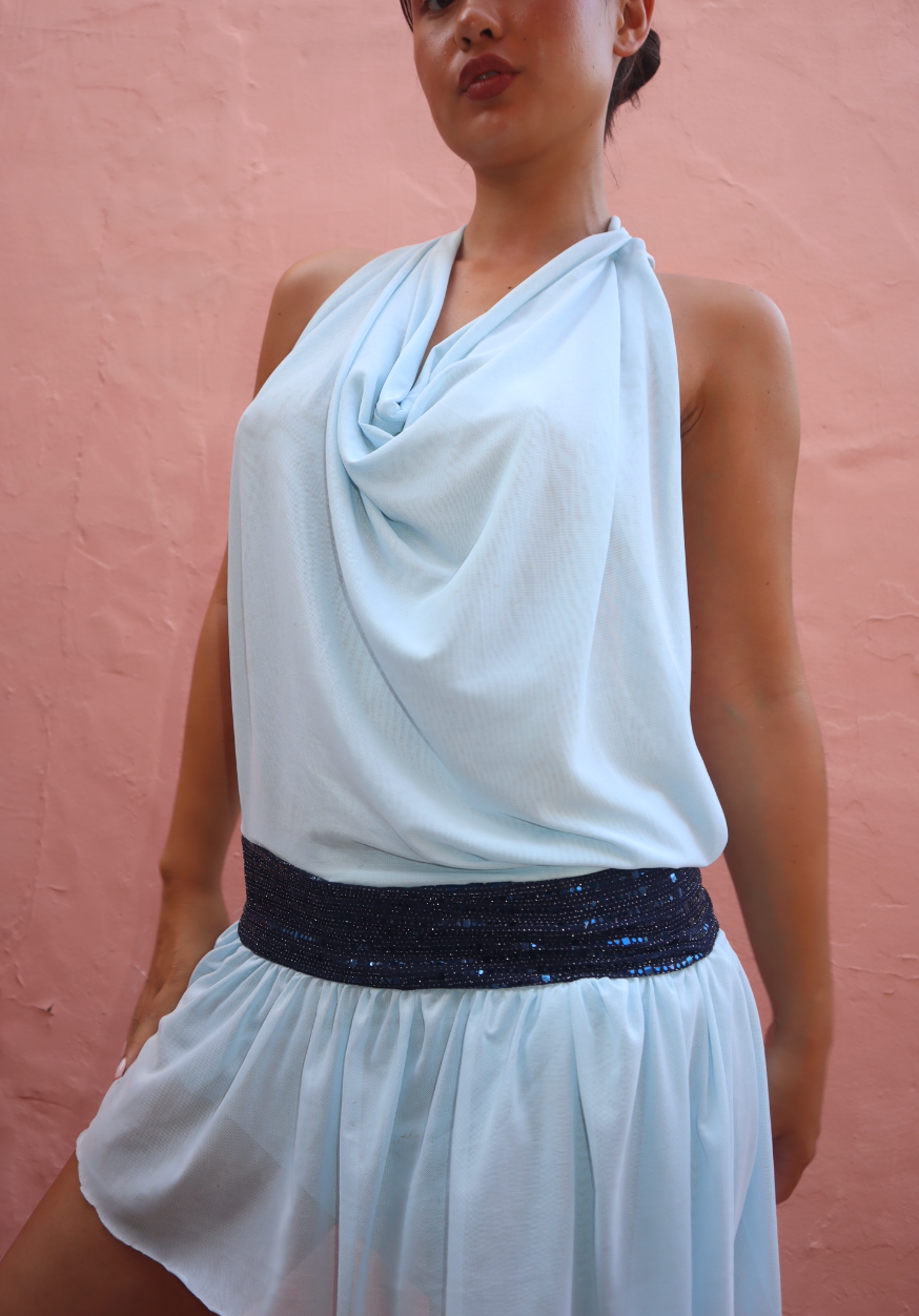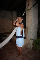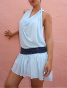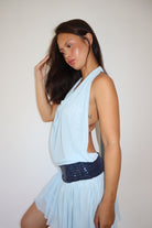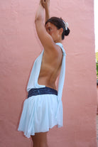 Meet Lou — a soft and playful mini dress in the sweetest shade of baby blue. With a delicate open back and a shimmering glitter band that subtly catches the light, Lou is made to make you feel effortlessly beautiful — whether you're dancing under the stars or soaking up the sun.